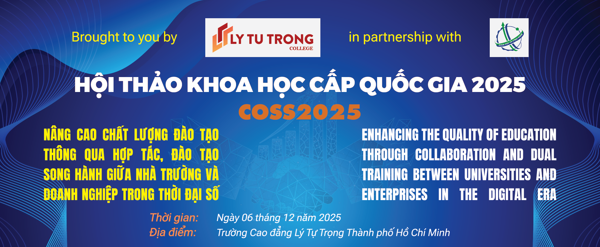 Hội thảo khoa học cấp Quốc gia COSS2025 ngày 06 tháng 12 năm 2025 tại Trường Cao đẳng Lý Tự Trọng Thành phố Hồ Chí Minh nhằm nghiên cứu, thảo luận và đề xuất mô hình cùng các giải pháp hợp tác đào tạo song hành với doanh nghiệp nhằm nâng cao chất lượng đào tạo, tạo bước đột phá trong việc cung cấp nguồn nhân lực có trình độ cao; Trao đổi, thảo luận về các nền tảng xây dựng mục tiêu đào tạo, chuẩn đầu ra phù hợp với yêu cầu thực tế trong thời đại số. Hội thảo cũng là dịp để các nhà quản lý, các tổ chức, doanh nghiệp và cá nhân có cơ hội tiếp xúc, trao đổi, nắm bắt về hiện trạng, giới thiệu về hoạt động và năng lực của đơn vị mình, tìm kiếm hợp tác, giới thiệu những giải pháp kỹ thuật công nghệ mới, liên kết đẩy mạnh phát triển và ứng dụng Công nghệ thông tin - AI vào trong quá trình đào tạo nhằm đáp ứng phát triển kinh tế - xã hội của đất nước và của Trường Cao đẳng Lý Tự Trọng Thành phố Hồ Chí Minh nói riêng trong thời đại số.
