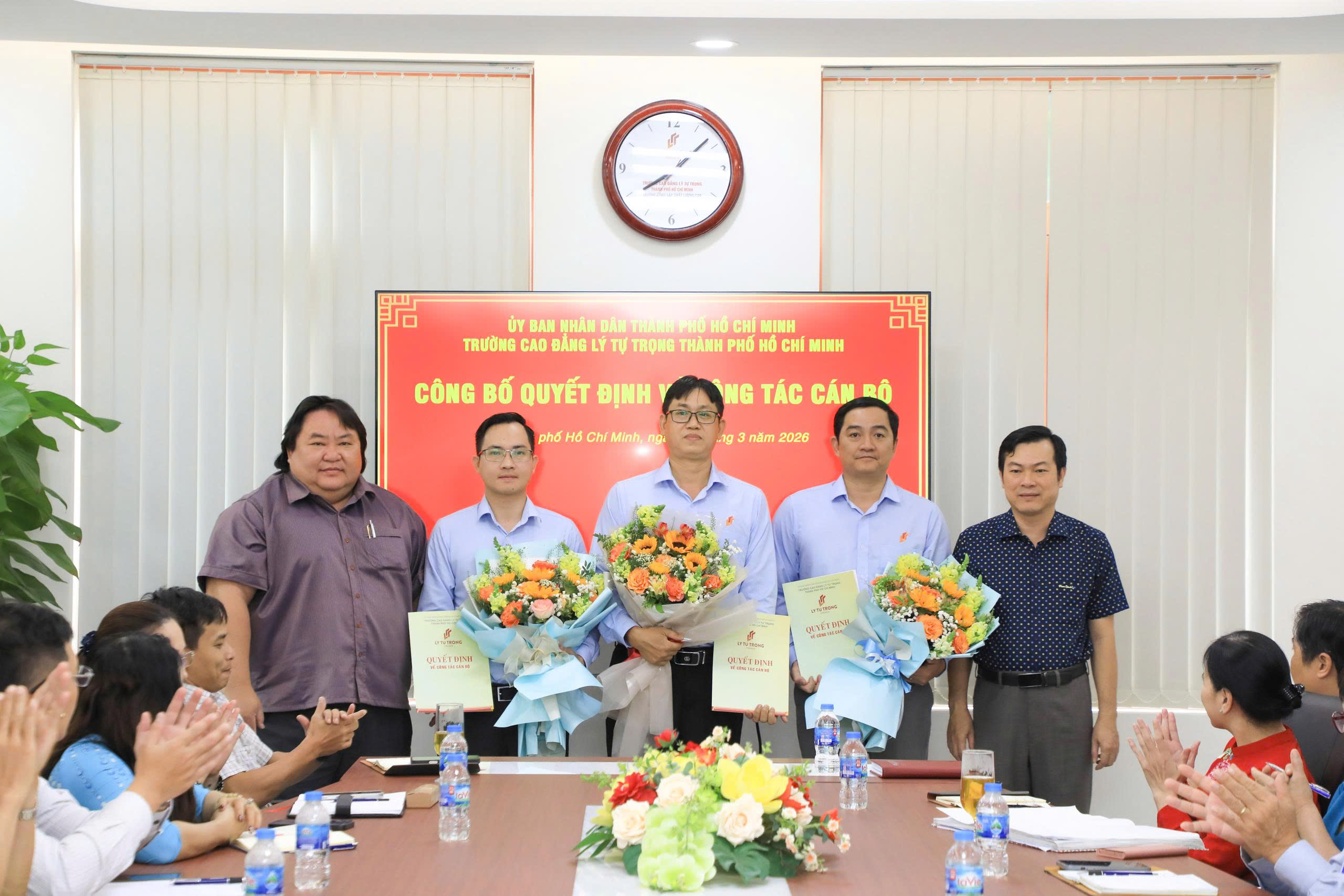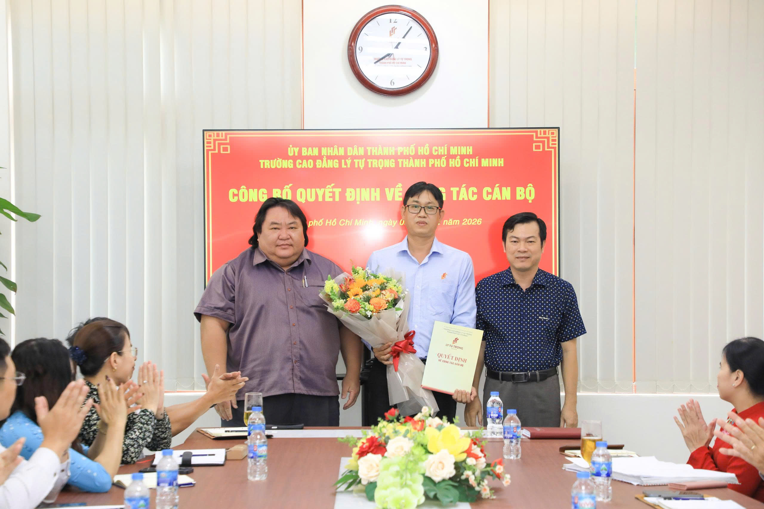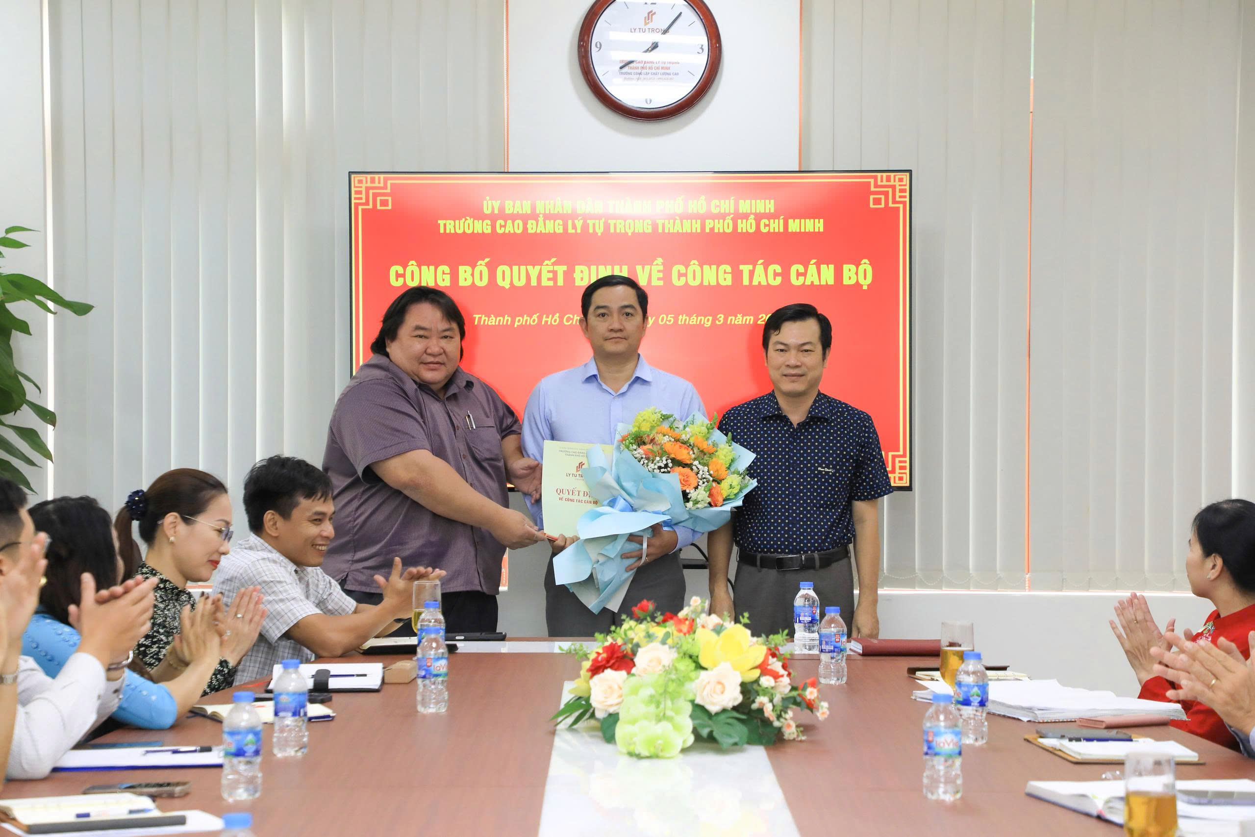 Sáng nay ngày 05/3, Trường Cao đẳng Lý Tự Trọng TP. Hồ Chí Minh đã trang trọng tổ chức Lễ công bố các Quyết định về công tác cán bộ: (1) Bổ nhiệm lại viên chức giữ chức vụ Trưởng khoa Cơ khí đối với NCS. Ths Chung Trần Thế Vinh; (2) Phân công viên chức quản lý kiêm quản lý, điều hành hoạt động Khoa Điện – Điện tử đối với ThS Quách Minh Thử; (3) Bổ nhiệm chức vụ Trưởng phòng Quản lý Đào tạo – Hợp tác quốc tế đối với TS Hoàng Văn Viết.